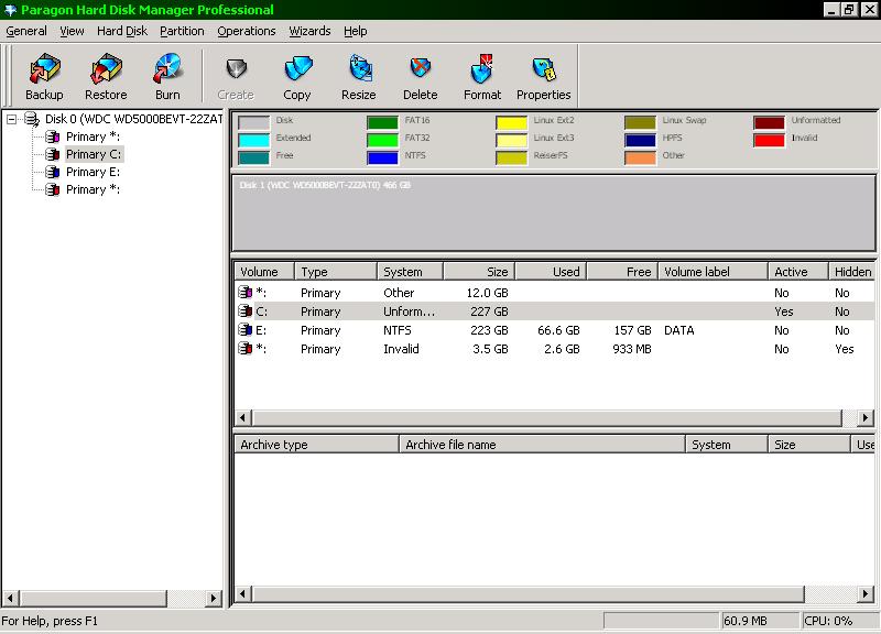 Загрузился бутцд, через Paragon Hard Disk Manager Pro посмотрел, что с разделами. Так выглядит, что диск вообще не разбит (см. картинко). Некоторые партиции как буд-то без системы, хотя в проводнике (Explorer) видны файлы, но не ко всем папкам есть доступ. А некоторые повреждены (invalid). Не смог найти никакой функции в этой проге и некоторых других, чтоб попробовать восстановить эти проблемы.