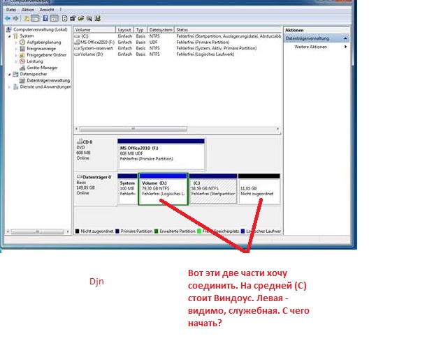 Купили жене комп, на котором фестплатта разделена на три части. Хочу сделать две, но не получается. Пробовал и через Computer Verwalltung. Система - Виндоус 7, диск есть. Кто объяснит реально последовательность операций?