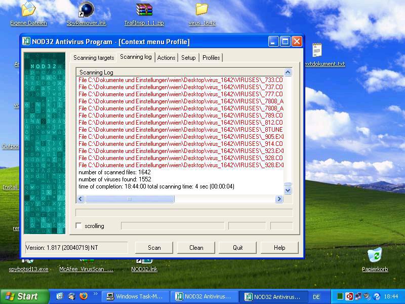 Тут такая маза пошла. Пару извесных сайтов решило проверить какие антивирусы лудше (спор там у них вышел). Вот и мне стало интересно и я решил тоже протестировать. Вот и вы можите подключится. Для этого скачайте virus_1642.rar потом разархивируйте это [password: http://komap.net.ru] тока невздумайте запускать там что-то. Теперь проверяйте эту папку вашем антивирусом. Там 1642 вируса. Посмотрим скока ваш анивирус найдёт. Самый лудший пока DrWeb он нашёл все 1642, у меня NOD32 он нашёл 1558, Касперски находит 1604
