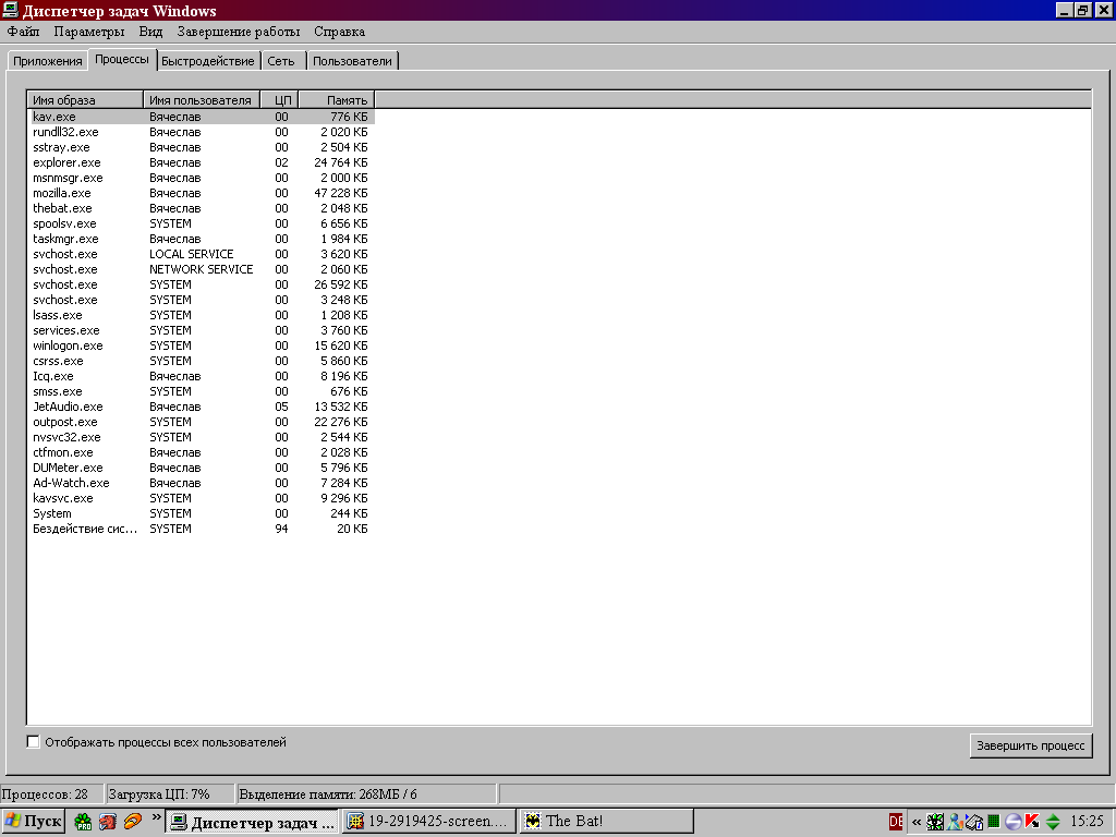 Теперь так. При старте виндоса Мозиллы, Jet Audio, аськи, thebat и так нет. Касперыча пробовал как-то отключать, мониторинг, тоже без толку. Что такое sstray.exe не знаю, знаю только что процесс этот системный, не вирь какой-то, а с моими знаниями отключать процессы, которые потом могут вызвать непонятки, мне бы не хотелось.