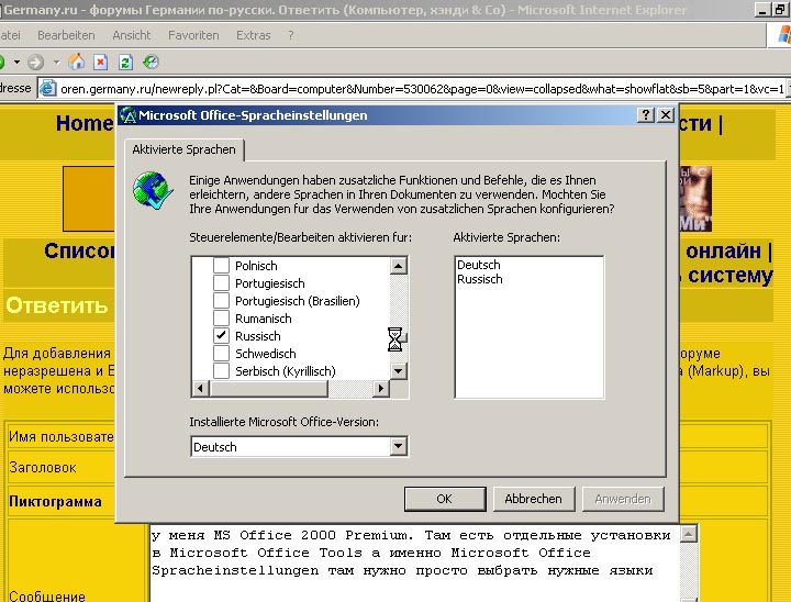 Ja poprobovala pereinstallirovat' MS-XP (ja ego installirovala poverh predydustschej versii), no v itoge - u menja est' vse programmy, est' perekluchenije "en-rus", odnako - russkij shrift ne reagiruet, a vsja podderzhka Windows - na nemezkom (kak i bylo pervonachal'no), malo togo - pri perezagruzke snova i snova pojavlajetsja zastavka "Microsoft Office 98".