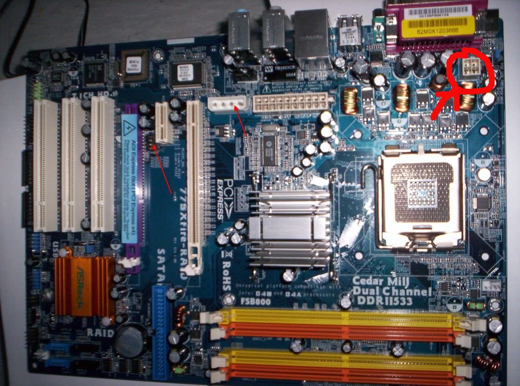Присмотритесь к фотке, там рядом с PCI-E слотом есть ещ╦ один вход для питания PCI-E графики. В моей материнке его нужно подпитывать независимо от присутствия подпитки на самой графиккарте.