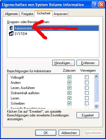 ,кликал на различные кнопки в регистре "sicherheit"(чисто интуетивно...) , видемо где то однажды правильно кликнул и папка стала открываться (System Volume Information на С )