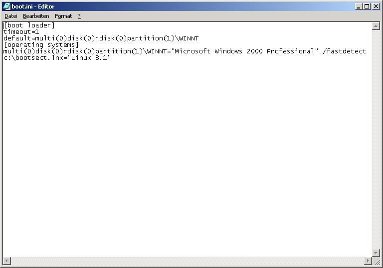 Как мне отредактировать Boot-menu (boot.ini) Win2000, чтобы по умолчанию загружался Linux? Сейчас, при такой раскладке (см. приложение) загружается Windows.