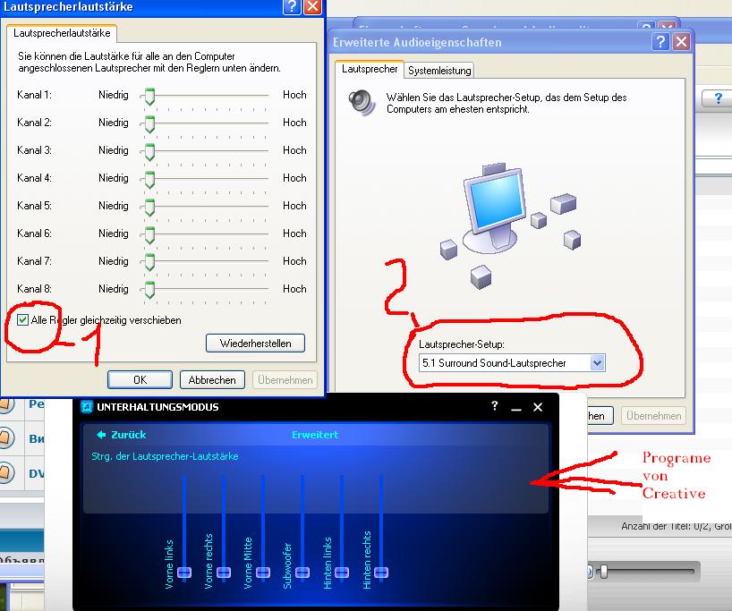 1. постоянно слетает птичка (поз. 1 на скрине). стоит мне только закрыть это окно ,потом снова открыть -птички нет и потом если я на плеере (вс╦ равно на каком)уменьшаю или добовляю громкость происходят совершенно непредсказуемые вещи. громкость изменяется то на передних то на задних колонках или только на субвоофере(без какой нибудь системы , всегда по разному ). и вообще ,почему там 8 каналов ,ведь у меня активирована толко система 5.1 (на скрине видно)