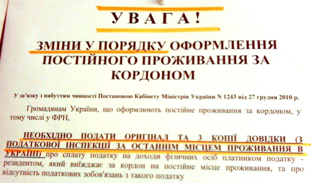 Для оформления в Украине выезда на ПМЖ за границу Украины и задолго до новогодних праздников (и даже прошлогодних) требовалось и требуется предоставление в ВГІРФО (ОВИР по-Вашему) справки об отсутствии у выезжающего задолженностей по налоговым платежам. Неохваченными до недавнего времени оставались, женившиеся/вышедшие замуж за иностранца, выехавшие по рабочей и другим визам и прочие студенты пожелавшие остаться на ПМЖ за границей Украины. Теперь этот пробел устранен.