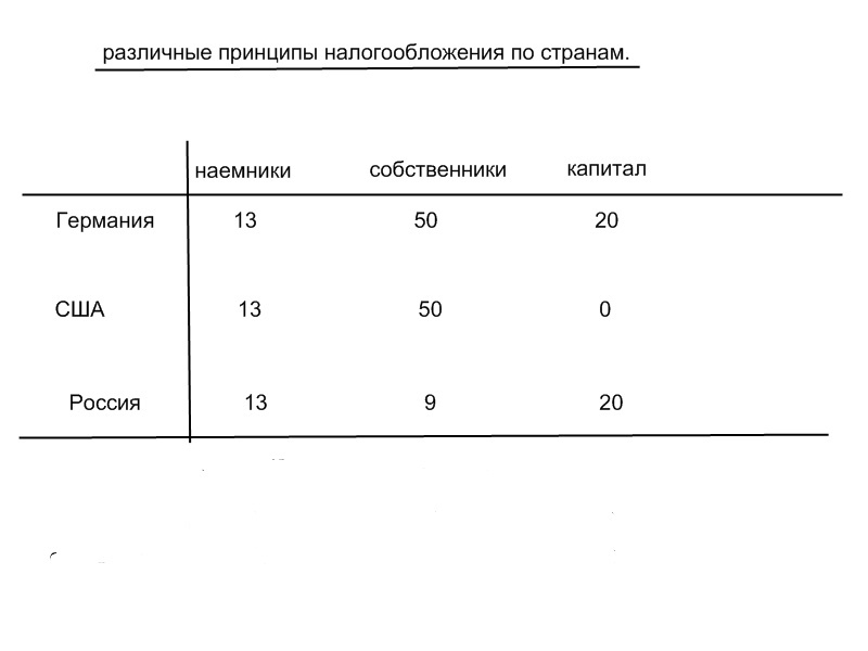 Есть три страны A,B и C. И есть три типа налоговых законодательства. Ставки налогов таковы. Вариант №1-наемники-13%, собственники-50%, капитал-20%. Вариант №2-наемники-13%, собственники 9%, капитал-20%. И вариант №3- наемники 13%, собственники 50%, капитал 0%. Вот чем отличаются эти типы налогов, тем отличаются и страны. Все остальное лирика.И я забаню, если не вернётесь к теме дискуссии.