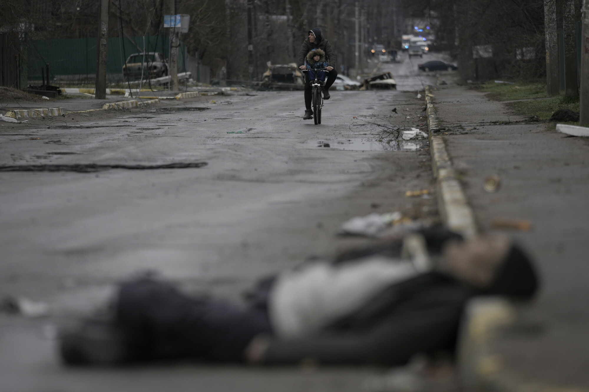 Тот, кто на велосипеде ехал и за угол завернул - это женщина в синей куртке с красными ногтями, которая на многих фото оттуда запечатлена. У неё ещё явно прострелена нога чем-то крупнокалиберным - ногу аж переломило и все мышцы разорвало. Вполне может быть попадание 30 мм снаряда. Зачем она завернула туда я не знаю. Возможно, растерялась и посчитала, что если она мирная, то её стрелять не будут. Или посчитала, что к солдатам безопаснее (кто её знает, почему). Или думала, что стреляют отовсюду, может даже сзади тоже.