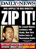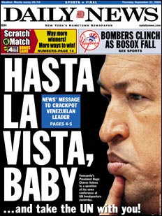 Чавес назвал Буша дяволом, по-католически перекрестился, поцеловал ногот болшого палца и сказал, что запахло серои.Вся ета клоунада произошла на заседании ООН в Ню Иорке.Свободу слова попробовал! Однако продает малоимушим США нефт подешевке, помогает. Венесуела на подэме - кто бы мог подумат. Заодно и с Ираном подружился, в обнимку. Что бы ето значило?