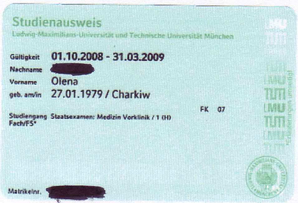 а Вам, в доказательство того, что все возможно, хочу показать свой Studienausweis. Без оценки 1.0 и за плечами с лингвистическим институтом я получила в Германии место на медфакультет чего и Вам от всего сердца желаю.