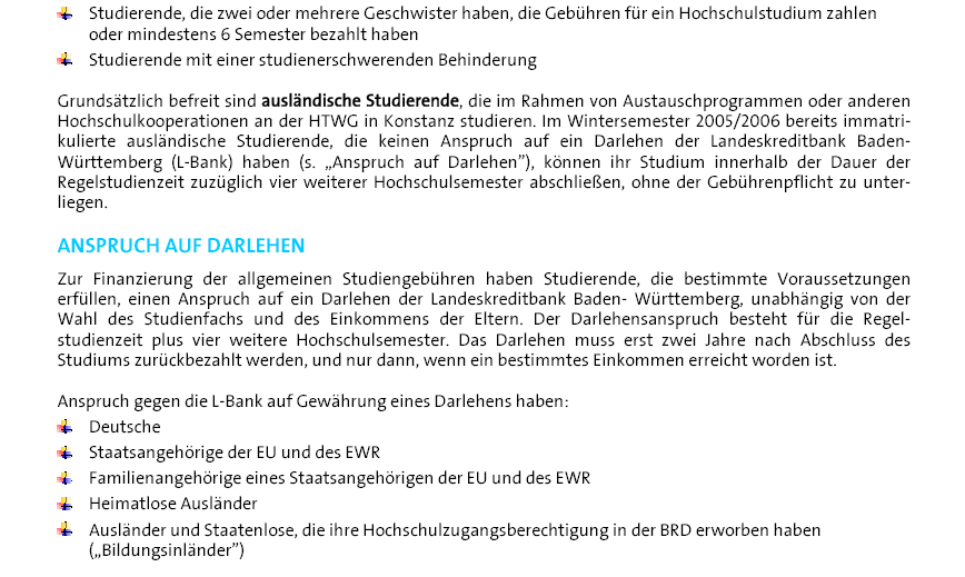 Короче я так поняла в разных учебных заведениях по разному. Только почему бы не сходить и самим не узнать, взять формуляр, если вопросы есть - на них работники ответят . Вот я тоже думала что у меня нет шансов, а пришла-чего то там посчитали и вот не буду платить 500 евро. )))))))))))))))))))