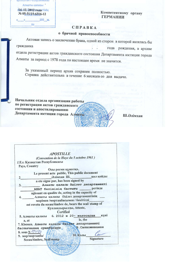 5. эти справки надо заказывать в двух экземплярах и с апостилем, а затем надо переведить и нотариально заверять перевод- один для посольства, второй отсылала в Германию, жениху для загса.
