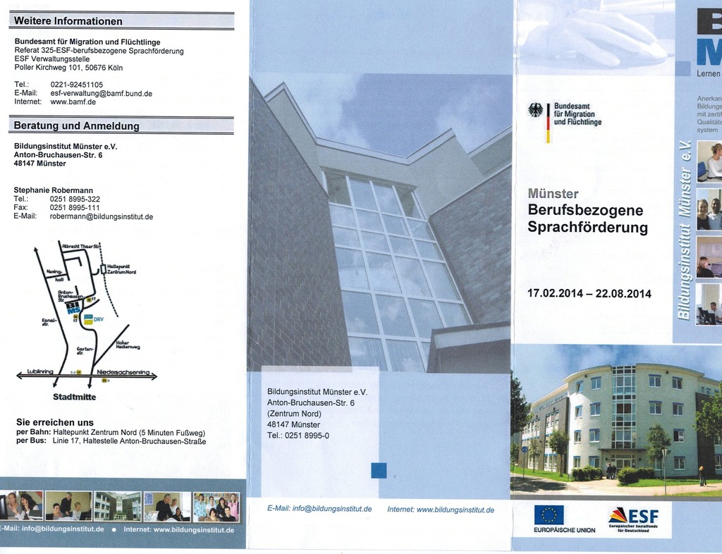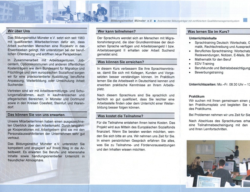 а вот информация о бесплатных курсах по немецкому языку для работы (т.е. при наличии справки из Арбайтагентур курсы оплачиваются Европейским фондом). инфа для Мюнстерланда, но вы можете поискать в своем городе- ключевые слова для поиска- название вашего города, Europäischen Sozialfonds, Berufsbezogene Sprachförderung