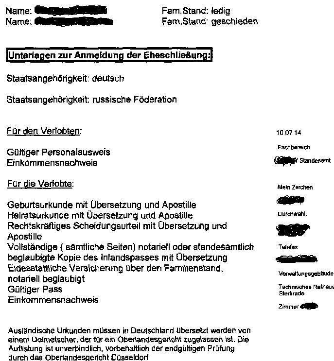 Здравствуйте! Были сегодня с БМ в Штандесамте. Получили список документов для регистрации брака в Германии (в приложении). Подскажите правильно ли я поняла процедуру апостилизации? Ставим на оригиналы документов апостиль, потом отправляю БМ документы и он переводит у переводчика в Германии. Так как нам сказали все документы переводить в Германии. ( NRW, Oberlandesgericht Düsseldorf) И еще вопрос,как делать апостиль на советское (зеленое) свидетельство о рождении? Это вообще возможно? Кто как делал?
