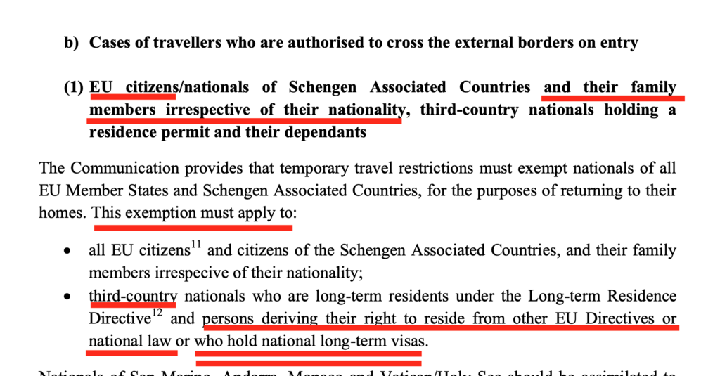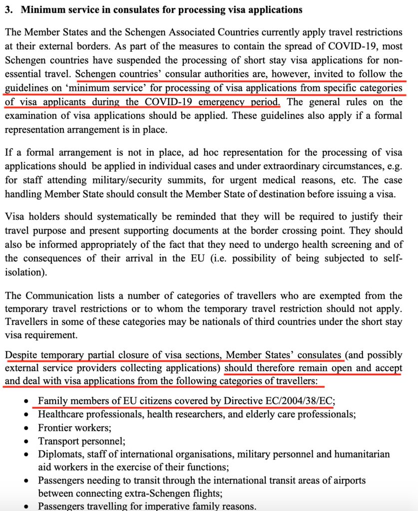 Всем доброго дня! Ну, во-первых, для статистики - воссоединение к супругу-гражданину Германии, Крефельд (NRW), 08.01.2020 подача заявления в визовый отдел посольства в Москве. Во-вторых, собственно проблема. Пока супруг пытается связаться с местным АБХ, закрытым на личный прием граждан и не отвечающим на email, с моей стороны было направлено письмо в посольство через форму обратной связи по ссылке germania.diplo.de. Ответ визового отдела не заставил себя долго ждать, резюме от АБХ к ним еще не поступало, И: В настоящий момент ОСТАНОВЛЕНА ВЫДАЧА ВИЗ НА ВОССОЕДИНЕНИЕ из-за запрета на въезд супругам граждан Германии/стран ЕС, не имеющих оформленного вида на жительство (прикладываю ответ посольства на немецком). Собственно, из-за такого ошеломляющего ответа и пишу сюда: у кого-нибудь в Москве/иных городах и странах сейчас есть прогресс по новым положительным решениям консульств? Ошеломляет ответ, поскольку не позднее чем 30.03.2020 решением комиссии Европейского Союза были окончательно утверждены рекоммендации странам-участницам по обеспечению въезда и визовой работы, в котором четко выделены категории лиц, попадающих под исключительную категорию имеющих права на въезд независимо от гражданства/вида на жительство - и там обозначены супруги граждан стран ЕС, НЕЗАВИСИМО от наличия у них вида на жительство. Ссылка на протокол комиссии на английском - https://ec.europa.eu/commission/presscorner/detail/en/ip_20_543, к моему посту прикладываю скриншоты конкретных пунктов. Вот теперь сидим и думаем, есть вообще смысл пытаться что-то доказывать посолсьтву (при условии, что получим ответ от АБХ и не будет улучшения ситуации с ограничениями из-за вируса)...