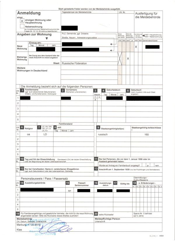 Это бумага, которую я получил в Einwohnermeldeamt, когда приехал в Марбург. Других бумаг, даже когда принёс к ним свидетельство о браке, мне не давали.