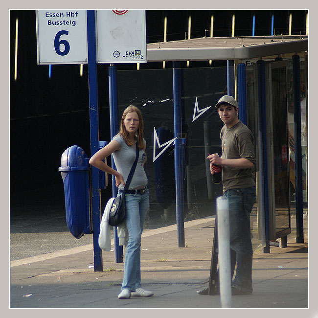 . Стрелочки я не рисовал, это стелянная стенка остановки позади героев такая...