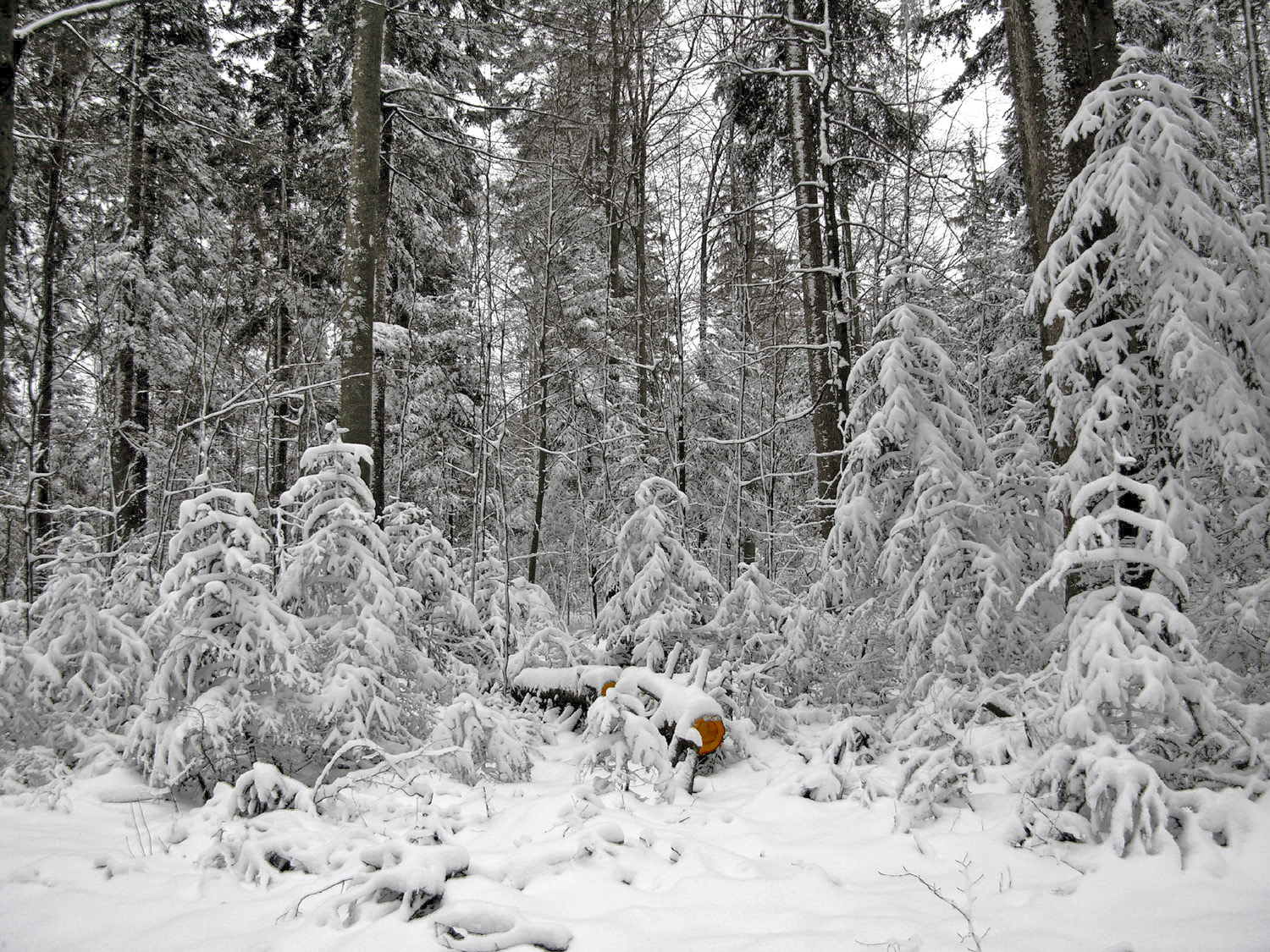 Я подумал, что снег на ветках примет бОльшую объёмность, если полутона будут более выражены, но это вызывает необходимость снизить контрастность снимка в целом, поскольку детали входили в противоречие с контрастом общей картины. А необходимый контраст для привлечения внимания вполне можно выразить цветовым решением - сделать так, что срез бревна будет контрастировать на цветовом уровне, а не на световом.