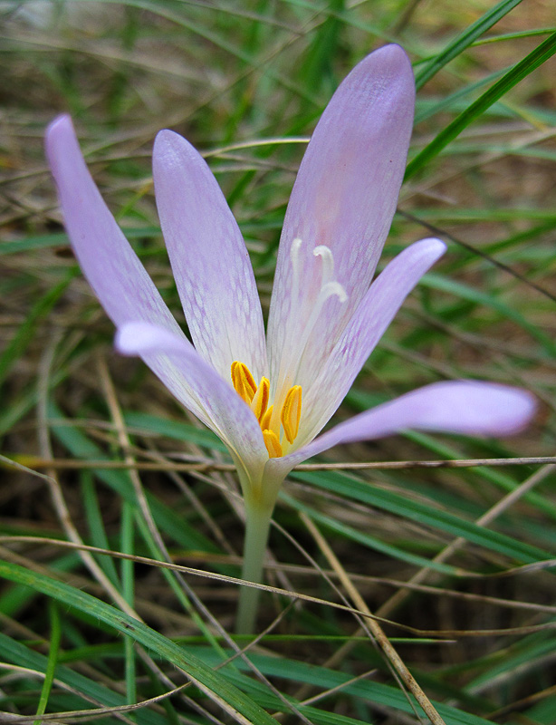 Лиловый без листиков Herbstzeitlose (то есть не в тему осенью цветущий тогда как его друзья крокусы отцвели еще весной) Colchicum autumnale. Красив но коварен. Зелень у него все же есть, но весной. Тогда его путают с черемшой. А осенью - с обычной съедобной луковицей. Очень сильно ядовит. Плохо то, что первые признаки отравления наступают через пару часов, когда уже и не знаешь на что думать...