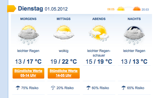 Вообще-то ожидается прекрасная погода - без дождя и солнца. www.wetter.com/wetter_aktuell/wettervorhersage/7_tagesvorhersage/?id=DE00...