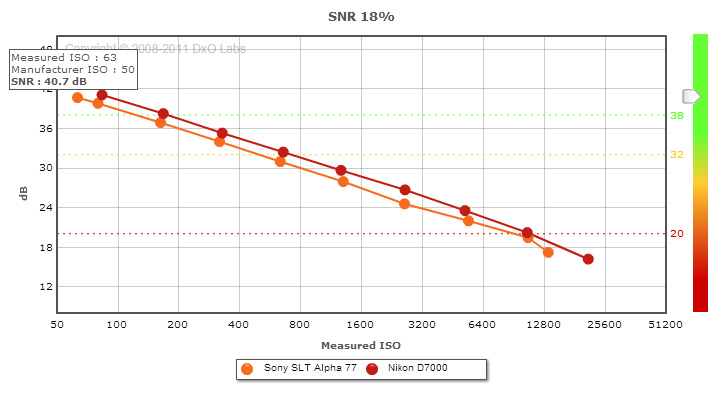 Sony A77: ISO 50 - Measured ISO 63 - SNR (Соотношение сигнал/шум) 40,7 dB
