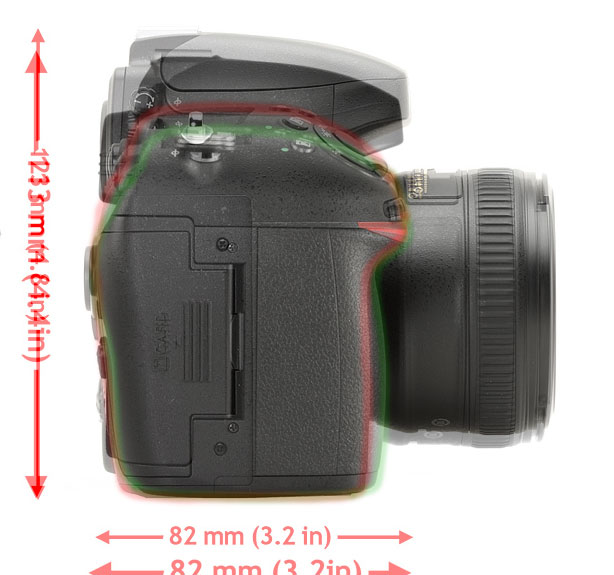 Тактильные впечатления очень приятные - сравнивал на месте с D800 - восприятие идентичное. Очень приятно удивила эргономика камеры. Несмотря на чувствительно более компактные габариты в руке лежит никак не хуже. Боковая часть, там где ухват, значительно толще чем у D7000 и сравнима с D800. Я постарался сделать графическое сравнение того, что я имею ввиду. Зелёным обведены контуры D600, красным - D800.