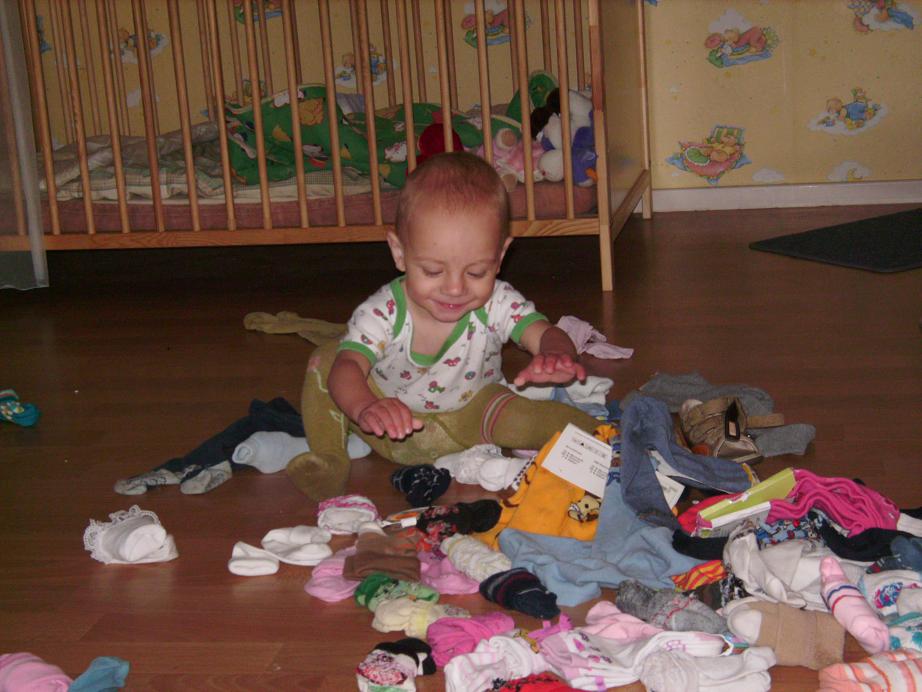 Зато когда рядом только свои - такой бесёнок, что держись! Ситуация с носками и другим содержимым ящиков повторяется у нас почти каждый день. Чтобы позвонить по телефону мобилизуется папа, развлекает дочурку, а мама скрывается в другой комнате. Через 2 минуты - топ-топ - ножки по коридору, надо проверить, где там мама? А-А-А! Телефон в руке держит, а ну давай сюда! Фотаппарат прожил у нас благополучно 5 лет, случайно попал в ручки малышке - с тех пор не дышит