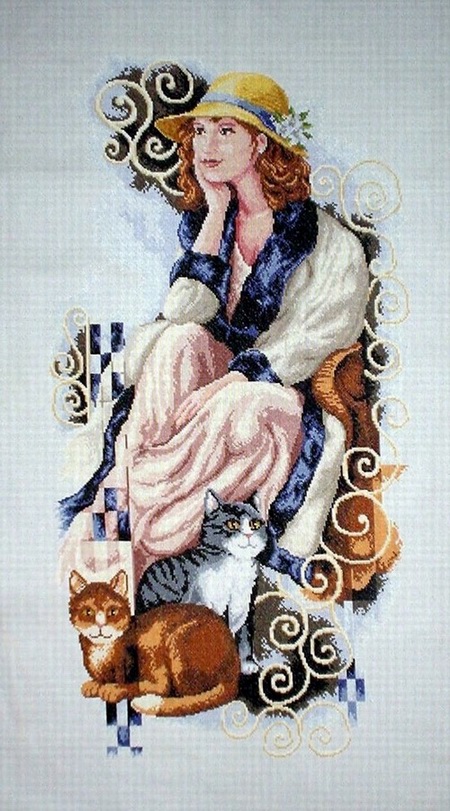 Вот ещ╦ из "неоформленного" .Эта дама с кошками вышивалась специально под новую мебель , но пока также не имеет рамы .Размер - около метра в высоту