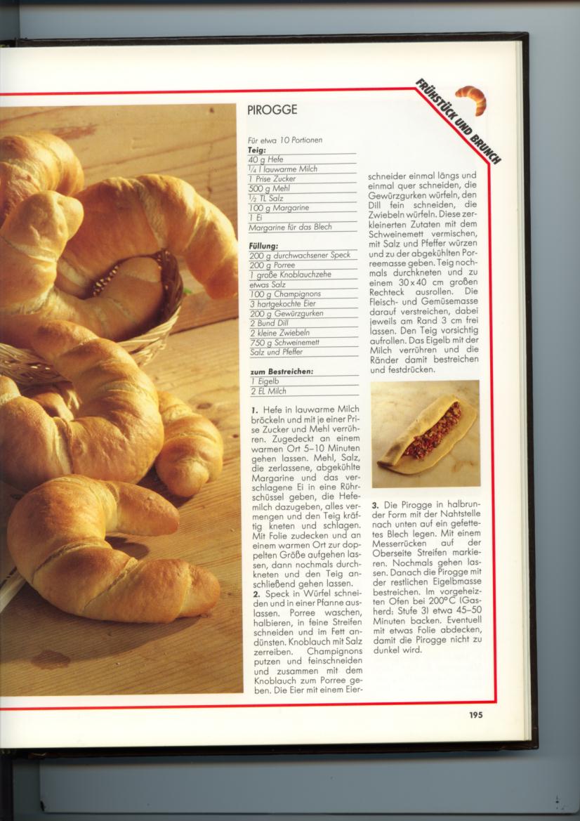 Den gut gekühlten Teig mit der ⌠Fettplatte⌠ verkneten und zu einer Platte von 50x50 cm ausrollen, halbieren und 16 lange Dreiecke ausschneiden. Zur Spitze hin aufrollen, zu Hörnchen formen, nochmals gehen lassen. Im vorgeheizten Ofen bei 225╟C ca. 20-25 Min. backen.