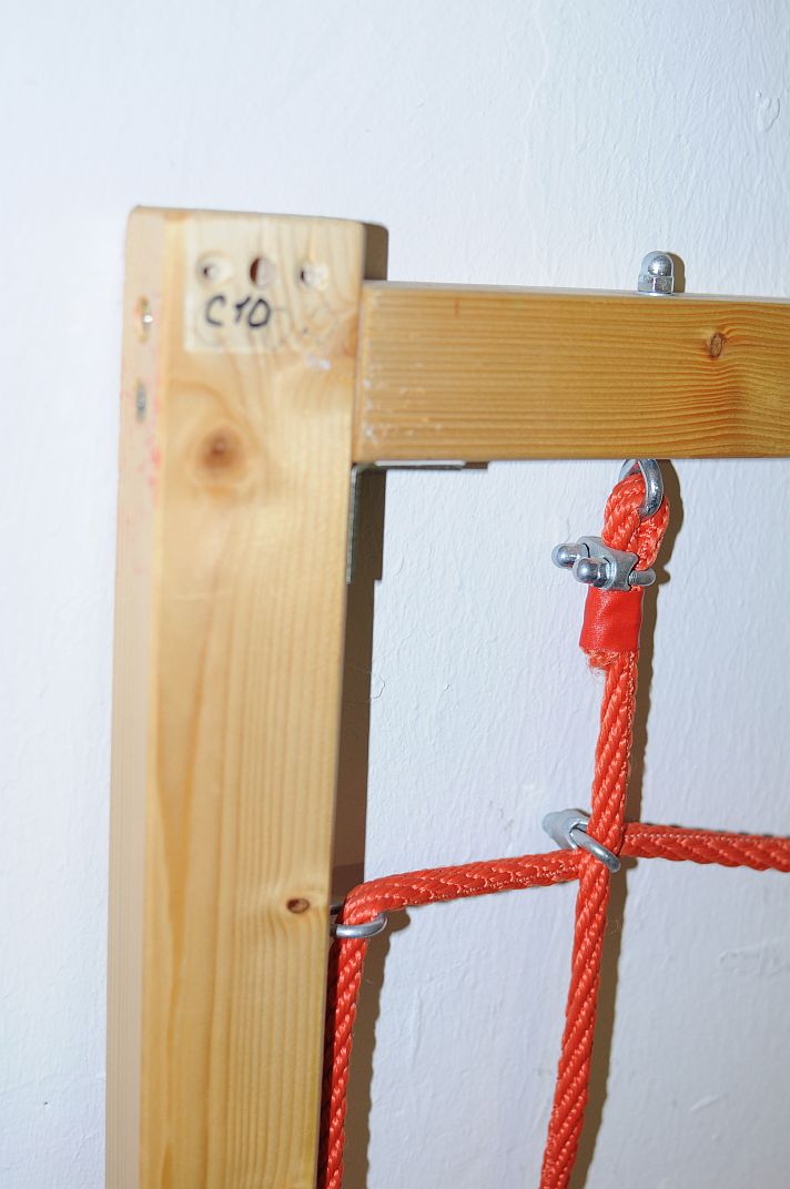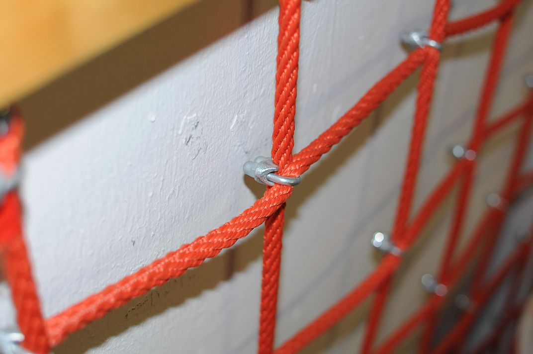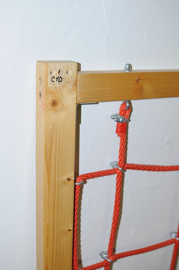 ...канатная сеть была главной проблемой - все, что видел в магазинах не нравилось, а найти элементы узлового соединения канатов за несколько недель не смог - интернет не помог, ходил по детским площадкам, переписывал названия фирм-производителей и искал/звонил потом - не продаются Seilknotenverbindungen, хоть тресни... может кому больше повезет или готовая сеть подойдет... мне лично размер ячеи готовых сетей слишком большим казался, для 3-4-5 лет ОК, для 1,5-2 летний имхо поменьше надо, 15 х 15 см примерно, иначе малыш в большую ячею весь "проскочить" может ...