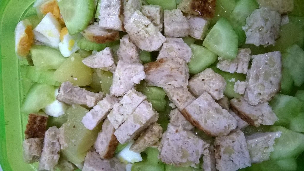 Вот мой обед: 4 вареных яйца, 3 вареных картофелины, пол-огурца, 2 котлеты из индюшатины и оливковое масло :)