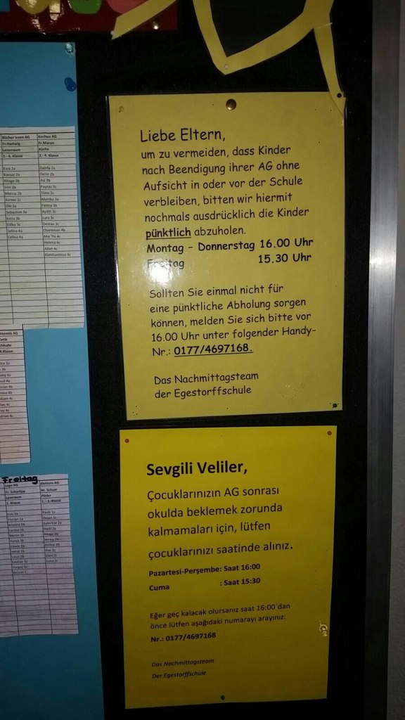 все обьявления висят в школе на немецком и на турецком/арабском каком-то