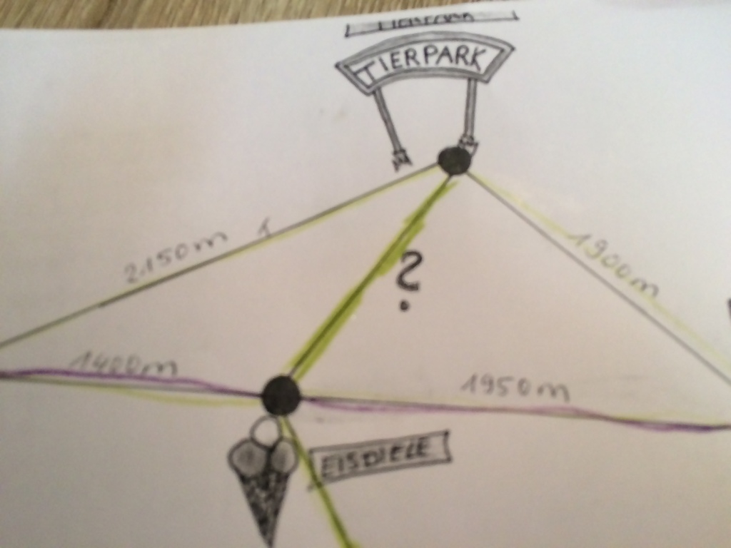 И задача не КАК дойти, а определить по схеме какое растояние ещё нужно будет детям ,образно говоря, пройти к тирпарку,после того ,как они поели мороженое. Определить можно используя известные растояния .И выбрать те из них, которые помогут в решении задачи.Соседний треугольник мы не можем использовать для решения нашей задачи.