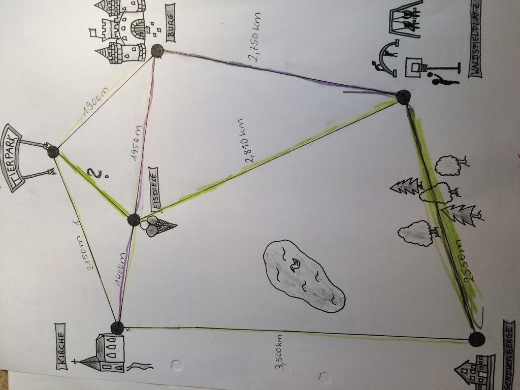 И судя по тому, что какие-то маршруты разным цветом прочерчены, очень много пунктов на маршруте и подробно расстояния указаны, скорее всего, у рисунка когда-то существовала текстовая часть.И там могло быть написано, как разные дети (группы детей) выбирали разные маршруты и разные цели.И стояло в условии обшее пройденное ими рассстояние (одинаковое или разница) или еще что-то.И тогда бы четвероклассник, складывая и вычитая, смог бы найти недостающее растояние.Тут 4го класса как раз хватило бы