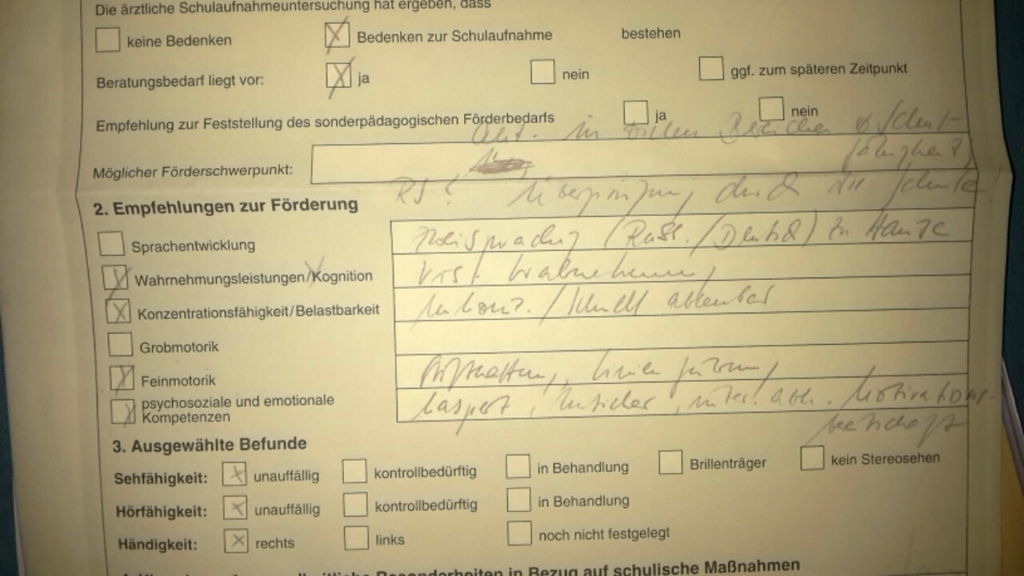 простите,но как "кривляние под конец"на столько может смазать картину?? Страдает концентрация, мелкая моторика, восприятие, психологическое и эмоциональное состояние и требуется фердерунг в этих направлениях....что ж вы у врача после всех крестиков не спросили, что она там накорябала...я поняла только "RückSprache: Überprüfung durch die Schule" и Russisch/Deutsch...