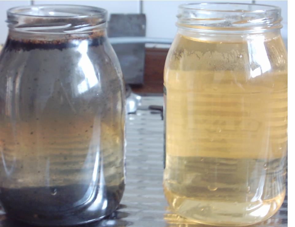 на снимке вода из крана после электролиза. Слева не фильтрованная, справа- фильтрованная.
