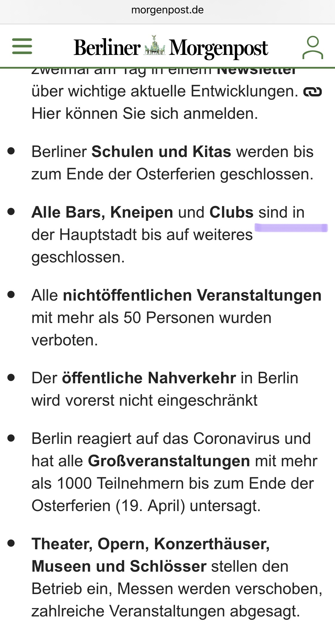Причём! Бары, клубы и Kneipe вроде должны были уже все закрыться. Школы и садики с понедельника, Музеи и большие концертные залы уже тоже закрыли. Как с ресторанами и кино, непонятно. Фитнесс студии ещё работают, и народ очень даже ходит.