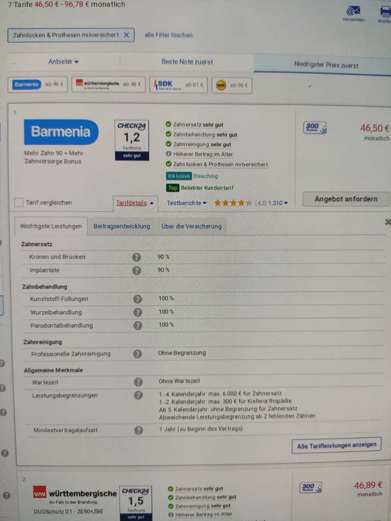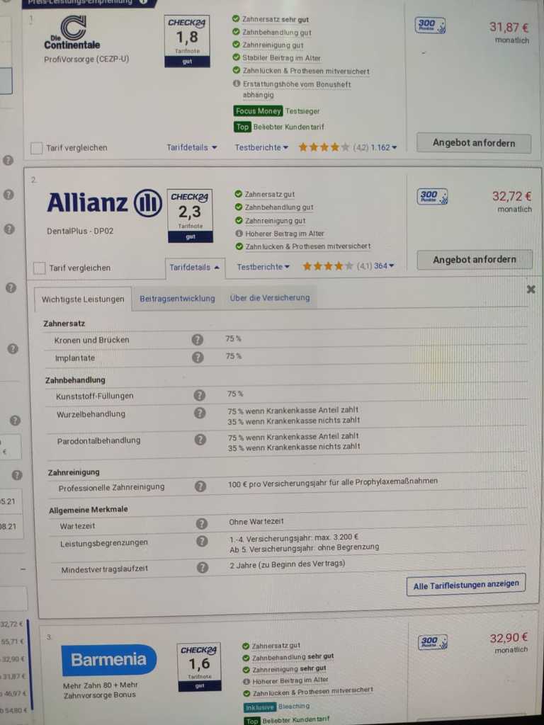 у всех страховок ограничения в первые годы действия (Staffelung(. у эрго вообще только 250 в год в первые 5 лет за цанерзац, у бармении 1500 в первый год, но только если не было рекомендованного лечения на момент заключения страховки.