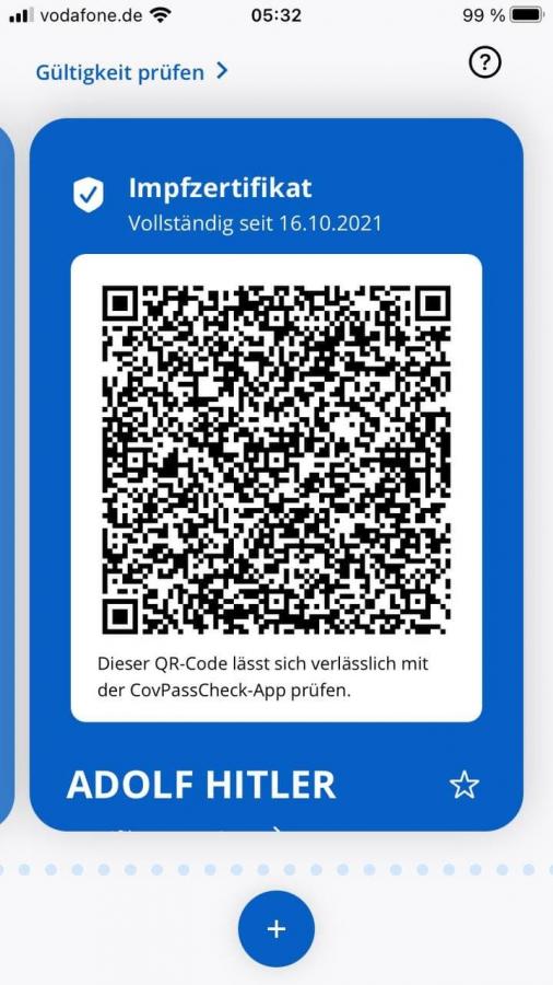 Jetzt auch „Adolf Hitler“ offiziell gegen Corona geimpftFake-Impfzertifikat wird von den Programmen akzeptiert