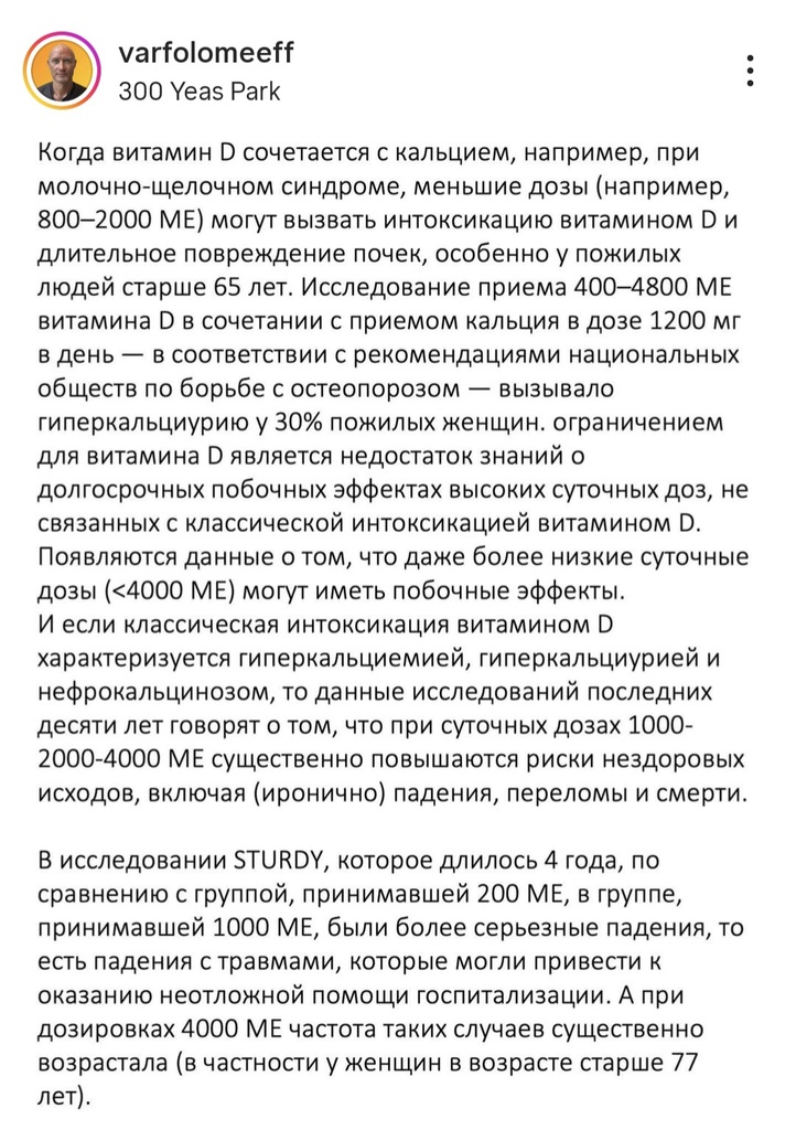 Это понятно. Только врач врачу рознь, читать и интерпретировать показатели не умеют, считать дозировку тоже. Кто то назначает мало. Вот я почти уверена, что Фандорин скажет 2000 это ни о чём. Кто то большие дозировки рекомендует. А в ссылке говорят (докмед) что побочки от высоких дозировок значительные и новые исследования не подтверждают их необходимость. Всё непонятно. У меня по анализам 29,8 vitamin d (berechnet) при норме 30-60. Назначили 4000 + к2 (этот тоже значительно понижен) каждый день. Врач хотела больше дозу назначить, но этот препарат следующая доза 7000, сказала много.