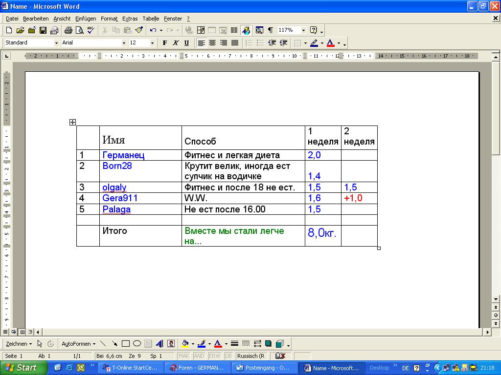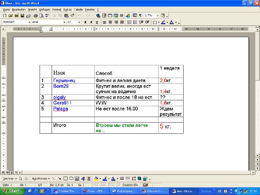 Кользуппе это хорошо, я пробовала, но не так, как там написано - неделю только его есть. Нет, я так, один день суп, пару дней нормально, пару дней суп, один день нормально. А то я считаю, что это слишком неполезно, постоянно капустный суп... ПОмогает, надо сказать. за один день худеешь на 1 кг. примерно. Вы, девчонки, не смотрире на мое фото, это я там толстая. Это было 3 года назад, я тогда весила на 12 кг больше, еще до приезда в Германию.