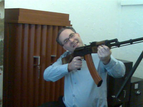С калашом !!! Типа отстраняясь, чтобы не поранило ... "Таких не берут в космонавты !"