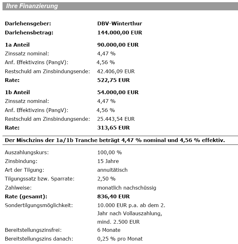 первый вариант с kfw, второй - без. Второй выложен в прикрепленной файле. Тут смущает, что сумма поделена на две части и Bereitstellungszins. Не "попадалово" ли это?