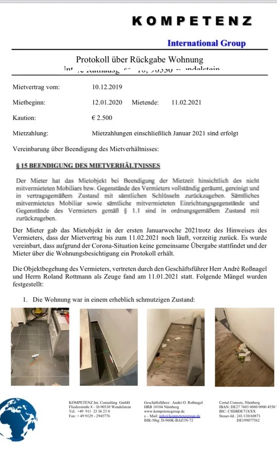 Пока квартира оплачена - вы можете войти и задокументировать все, что указано в счёте, фотографиями. Вас разводят по полной, как детей. В принципе, в таком деле и адвокат не нужен - достаточно хорошего немецкого языка у мужа и вашей подборки законодательной базы для его речи в суде 🙂