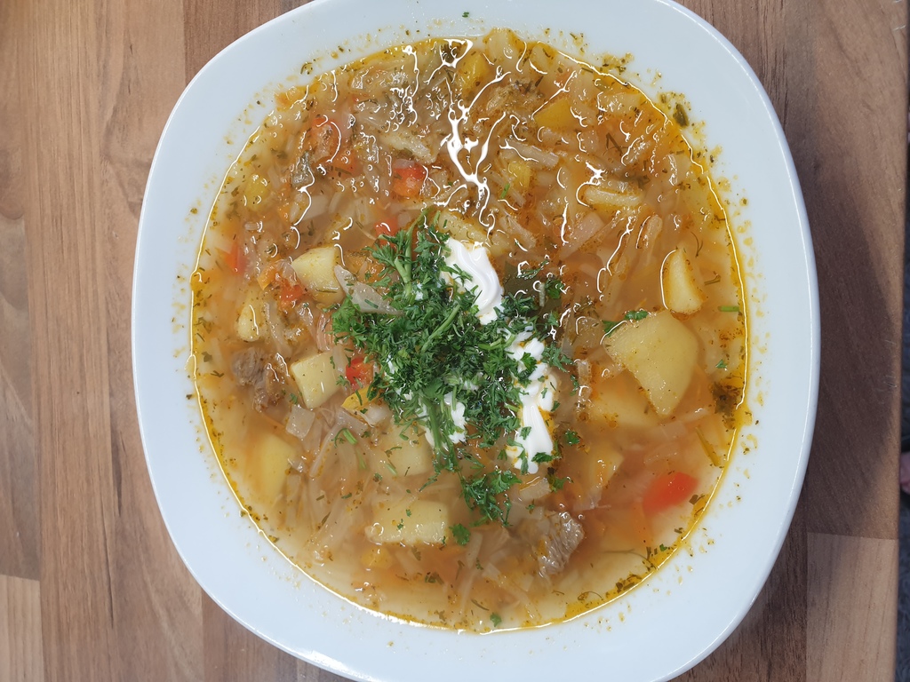 Щи с говядиной, свежей капустой и (о,боже!😱😁) майонезом.))