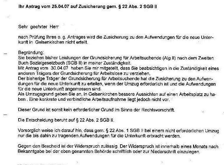 мой муж-коренной немец,с совершенно минималной пенсией, жил в пригороде киля в однокомнатной квартире...после регестрации брака и моего приезда решили переехать в город.я с первого дня получила алг2 и искала работу.ну и вроде в городе легче найти ...и еще полгода мучались в той квартире с канализацией,я даже фото этого безобразия делала...муж все решил сделать без разрешения и сразу урезали квартирныена 60 евро меньше ,чем по нормам города...несколько раз писали видерспрухи,каждий раз разный служащий невнятно объяснял-не положено!на просьбы прислать ответ писменно-ничего...и вот в прошлий четверг попали к моему основному бератору и все встало на свои места...надо было брать разрешение и все бы было ок...но т.к. я и била на 10 недельных курсах-масснаме,2 раза на практике и теперь немного работаю с надеждой скоро
