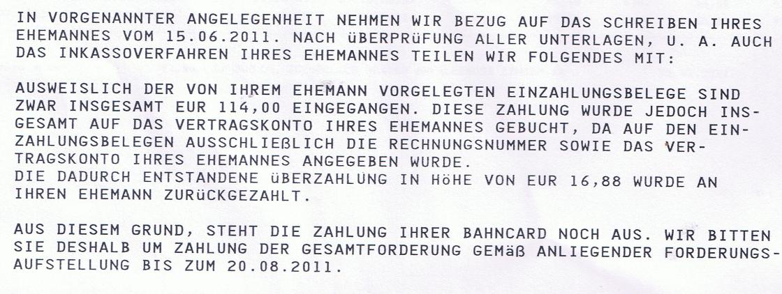 Вышло у нас недоразумение с Дойчебаном , то ли они счета не прислали, то ли счета потерялись , вообщем после напоминалки заплатили , через неделю получили письмо от Инкассо. Письмо мы проигнорировали , теперь они нас достают . Пытались разобраться с ДБ , но они нас нафик вежливо посылают и грят подтвердить вашу оплату в инкассо не можем разбирайтесь с ними сами . С инкассо договорится тож не получается , мы им отослали копии оплаты счетов в ДБ