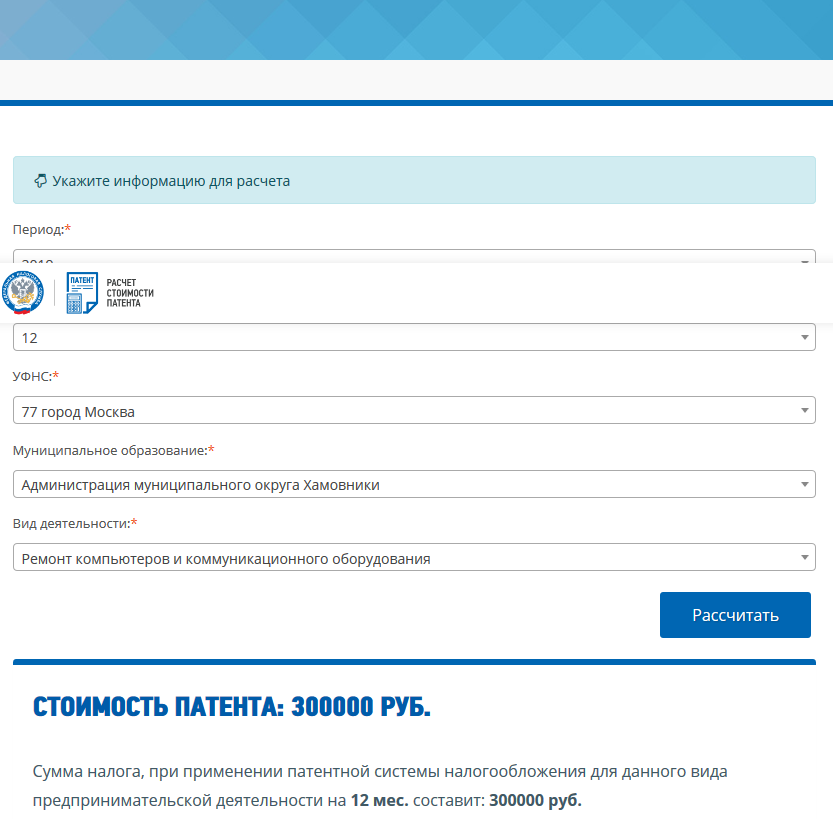 докупаем патент для программиста - 300 тысяч на год. Налоговая говорит: Патент это авансовый платёж 6 процентов, тоесть обычный московский программист зарабатывает 5 миллионов в год! Докупаем патент на ремонт компьютеров, он кстати тоже 300к, получается ещё пять миллионов. в итоге зарабатываем 10 миллионов в год или 834 тысяч в месяц (417+417)