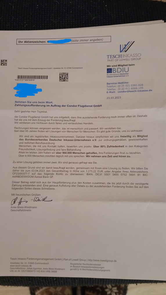 Здравствуйте, сегодня я получил письмо от Tesch Inkasso о том, что авиакомпания Condor имеет претензии ко мне и что я должен им 1275,22 евро. Я хотел бы отметить, что я никогда в жизни не пользовался услугами этой авиакомпании! В конце января я искал авиабилеты в Канаду и выбрал Condor, забронировал билеты, но не оплатил. Изучив вопрос перевозки моего питомца, что было главным критерием при выборе авиакомпании, я пришел к выводу, что Condor мне не подходит, и примерно через 3-4 дня отменил бронирование, так как от них приходили сообщения о том, что есть неоплаченные билеты. Через два месяца на адрес моего временного проживания в Польше было отправлено письмо-напоминание от 12 апреля 2023 года со сроком погашения долга до 3 апреля 2023 года. В настоящее время я нахожусь за пределами Европейского Союза и не знаю, как реагировать. В письме кроме польского адреса и имени и фамилии нет никакой информации, только у вас есть долг, оплатите. Я не понимаю, откуда взялись эти долги и почему я должен их оплачивать. Кто, что подскажет что делать в такой ситуации? Или вообще не вестись на подобный скам? Спасибо!