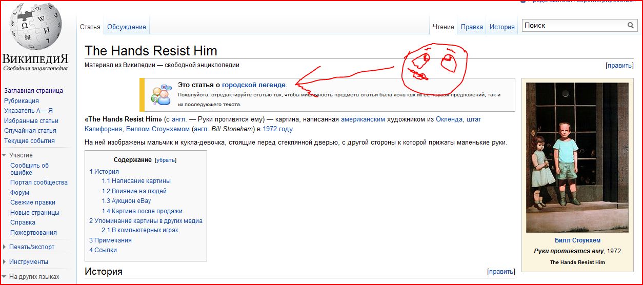 я не понимаю, где вы видите противоречие. Мне в этой теме не идет речь о том, что сделали из этой картины те люди, которые ее купили и потом получали впечатления, мне не идет речь о том, что эти люди рассказывали ужасного. Меня не интересует легенда. Мне речь идет только о том, какое впечатление эта картина производит сама по себе. Что касается "Руки препятствуют ему", то это тоже по стилю вовсе не хоррор, а сюрреализм. Хоррор - это то, что сделали люди из этой картины на основании тех впечатлений, которые она делала на людей